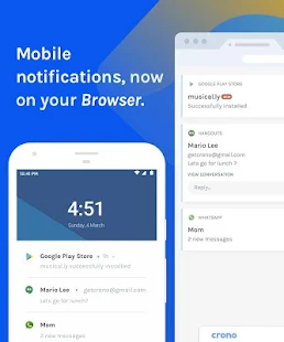 إذا كنت شخصًا يقضي وقتًا طويلاً في Chrome ، فسيكون Crono هو التطبيق المناسب لك. تعمل هذه الأداة على نسخ إعلامات هاتفك بذكاء إلى متصفحك ، مما يعني أنه ليس عليك فتح هاتفك مرةً أخرى ومرة أخرى للتحقق من الإشعارات.
